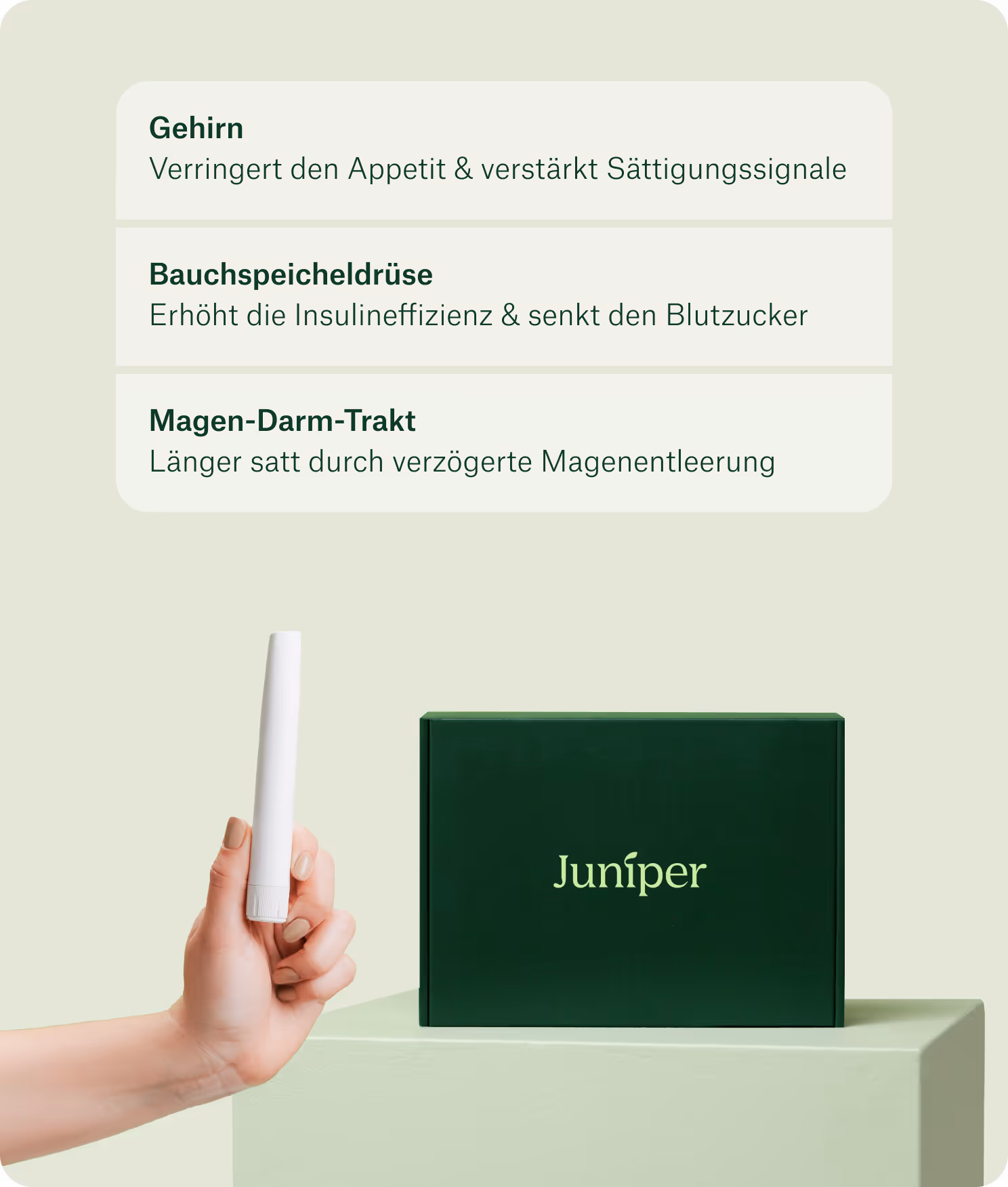 Die Abnehmspritze enthält ein natürliches Hormon, das Appetit, Verdauung und Blutzucker reguliert. Juniper Teilnehmer:innen verlieren erfahrungsgemäß in 4 Monaten bis zu 12 kg & in 6 Monaten bis zu 30 kg.